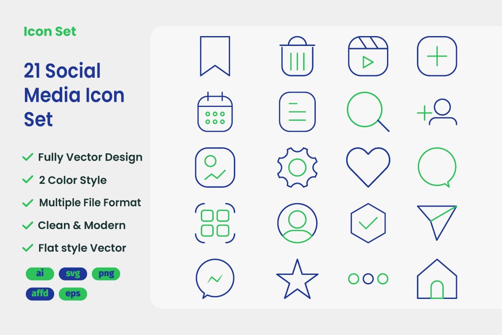 Enhance your design projects with this modern Social Media Icon Set, designed in a clean two-tone outline style. Ideal for websites, mobile apps, UI/UX, dashboards, social platforms, and branding initiatives. This package includes fully editable vector files, enabling you to customize colors, stroke size, and shapes to match your brand requirements.