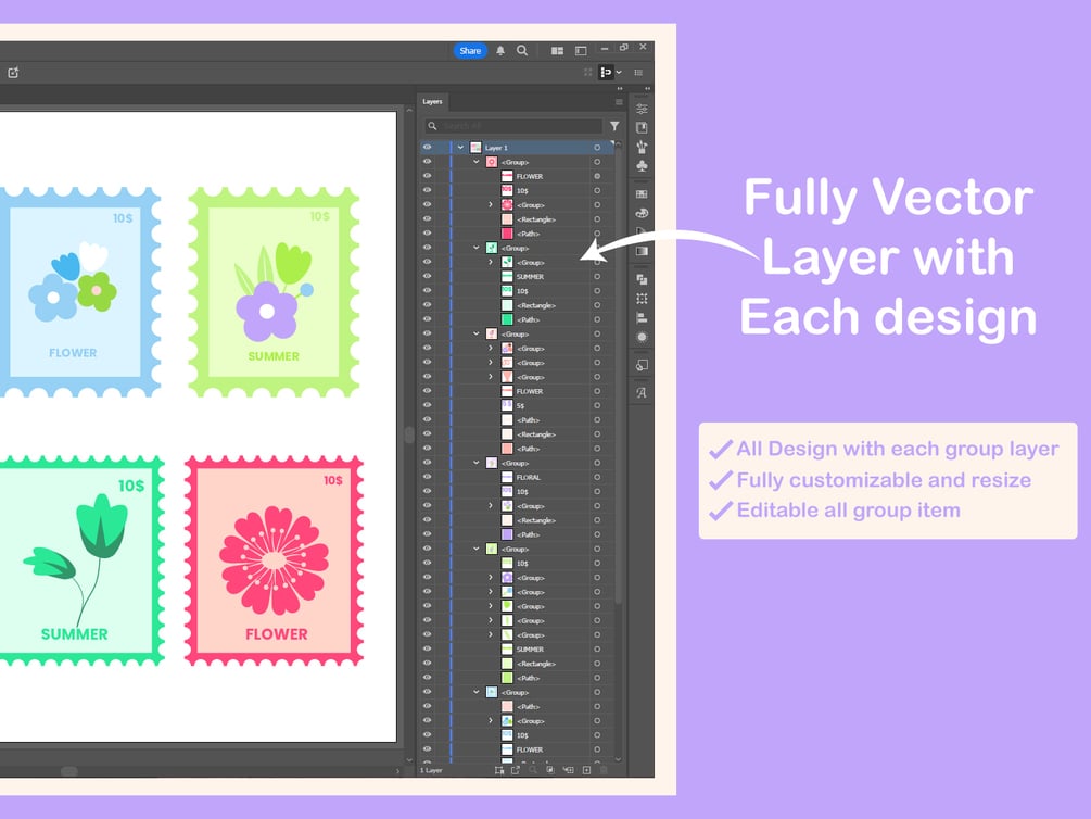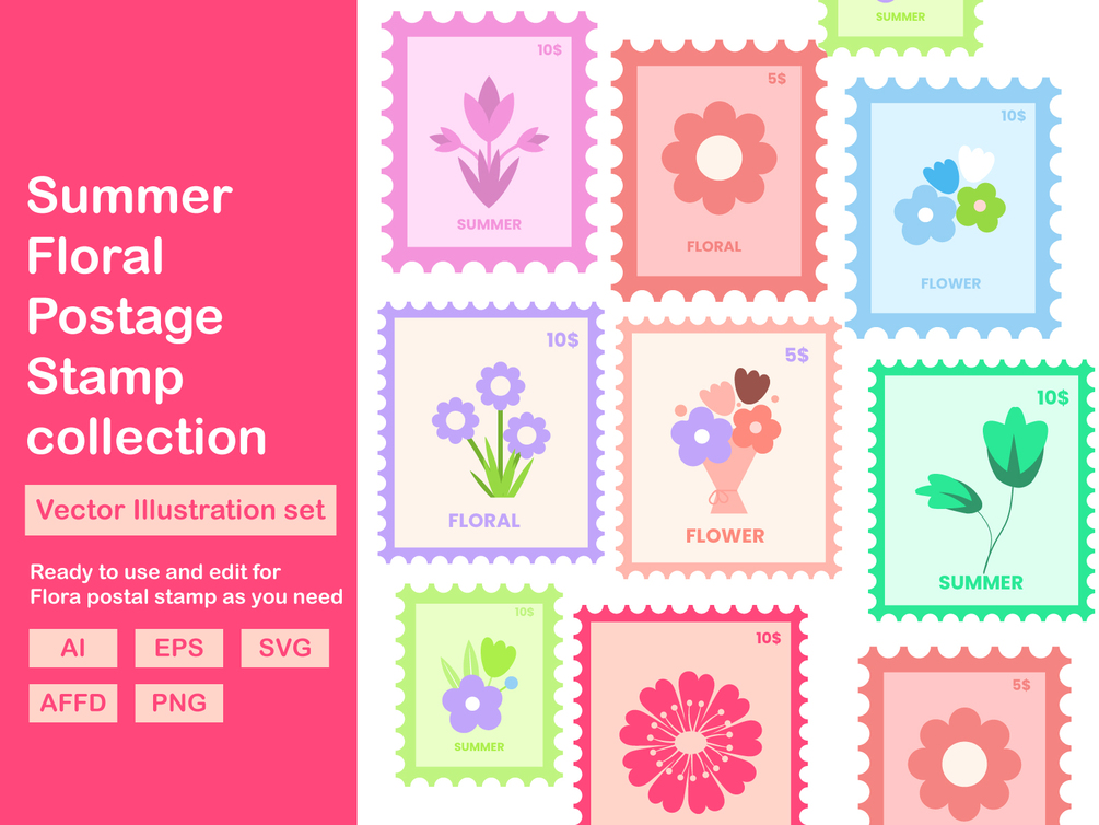 Enhance your creative project with this vibrant set of floral postage stamp vector designs. This bundle includes eight colorful, cute, and modern stamp designs. These illustrations are ideal for use on stickers, scrapbooking, planners, greeting cards, journals, digital artwork, and more. Each stamp features a clean, flat design style and incorporates elements inspired by summer and flowers.