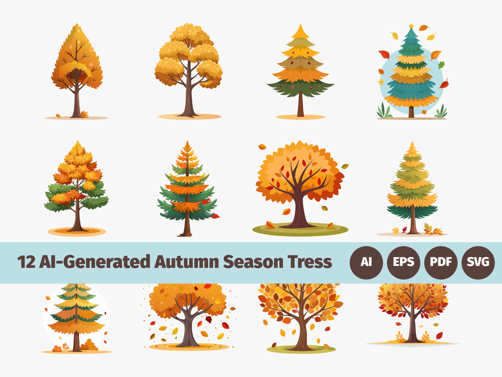 Celebrate the beauty of fall with this 12 AI-Generated Autumn Season Trees Illustration Set, designed to add warmth and natural charm to your creative projects. Each tree illustration highlights the vibrant colors of autumn — from golden yellows and rustic oranges to deep forest greens — making it ideal for seasonal design themes.