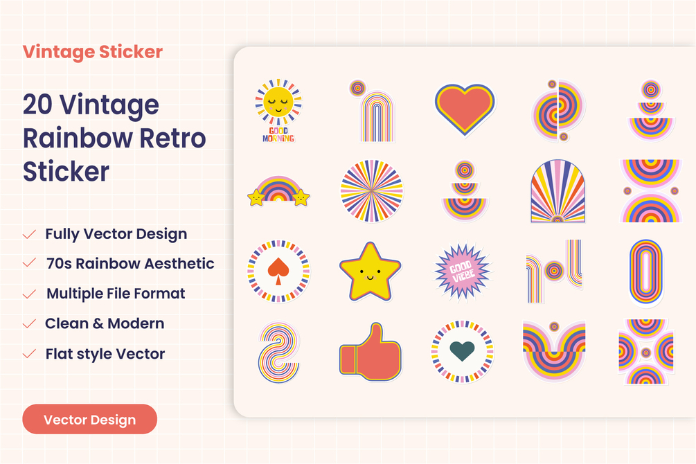 Bring retro charm to your creative projects with this 70s Vintage Rainbow Sticker Pack — a vibrant collection of colorful rainbow-inspired icons, badges, shapes, and geometric elements. Each sticker is designed in a nostalgic 1970s aesthetic, featuring warm tones, playful curves, and positive vibe messages like "Good Morning" and "Good Vibes."