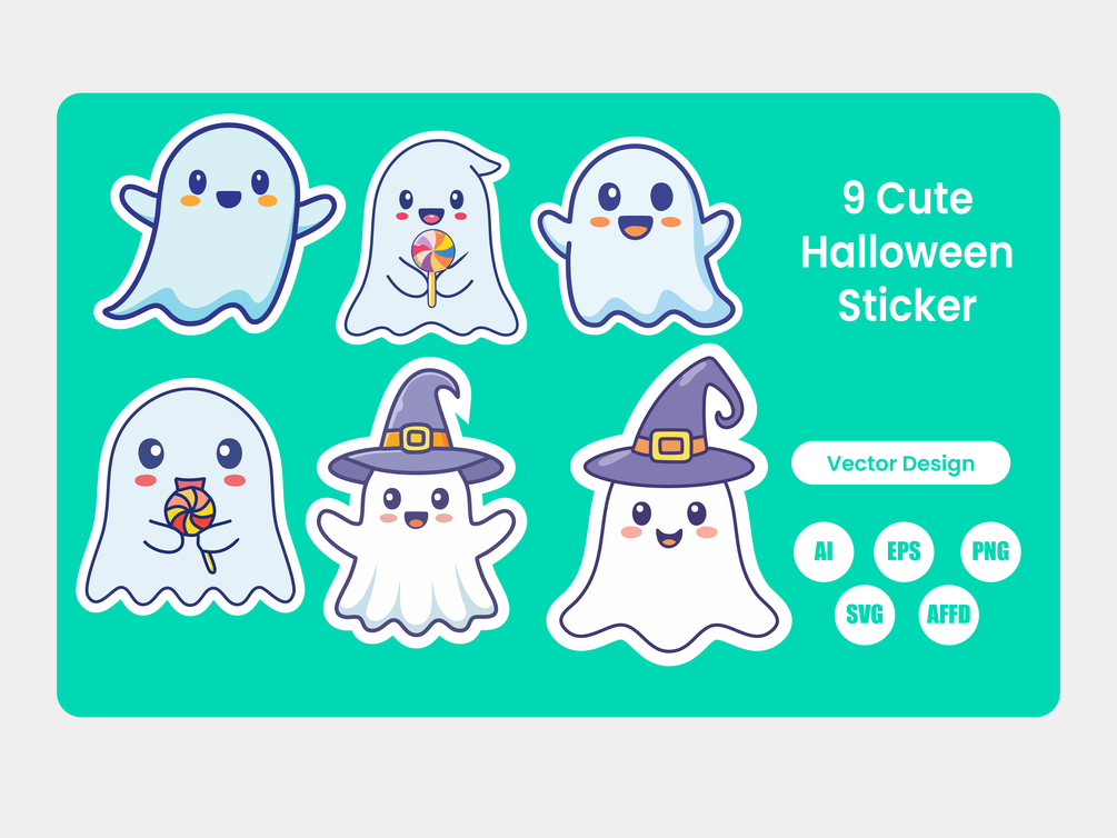 Add a playful, spooky touch to your designs with this unique set of 9 Halloween Ghost Stickers! Each sticker features a cute cartoon ghost accompanied by fun Halloween elements such as candies, witch hats, pumpkins, and trick-or-treat bags.