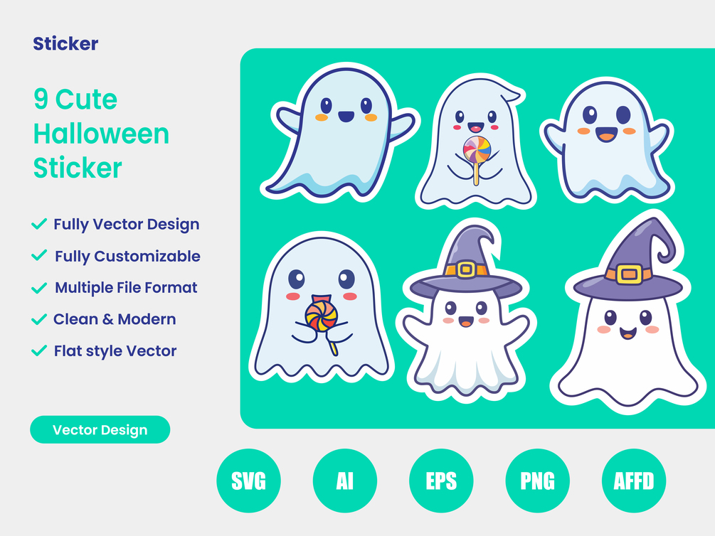 These charming vector ghosts are ideal for stickers, social media posts, digital products, greeting cards, children’s artwork, and Halloween merchandise.