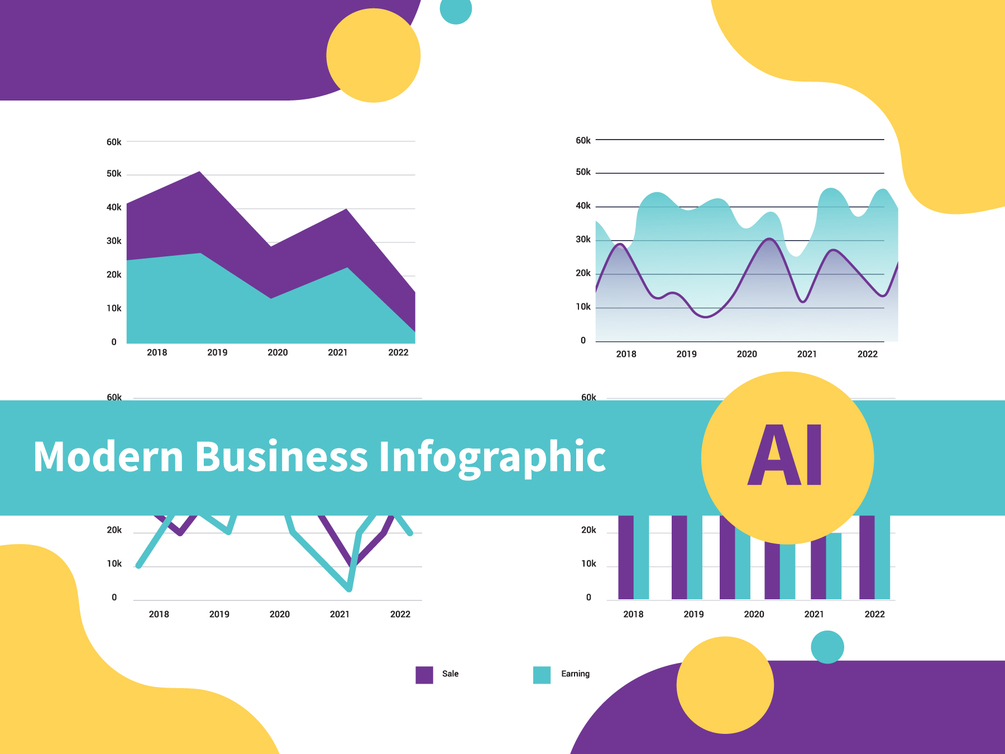 Present your data stylishly with this modern business infographic dashboard. This template features multiple chart variations (area, line, bar, and combination charts) to visually compare sales and earnings performance from 2018 to 2022.