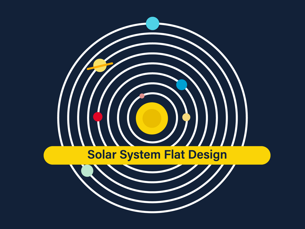 A minimal, flat-style illustration of the solar system features the sun at the centre, with planetary orbits circling it. The eight planets—Mercury, Venus, Earth, Mars, Jupiter, Saturn, Uranus, and Neptune—are arranged in concentric circles. Each planet is represented by a colorful, simple shape, and Saturn is depicted with its distinctive rings.