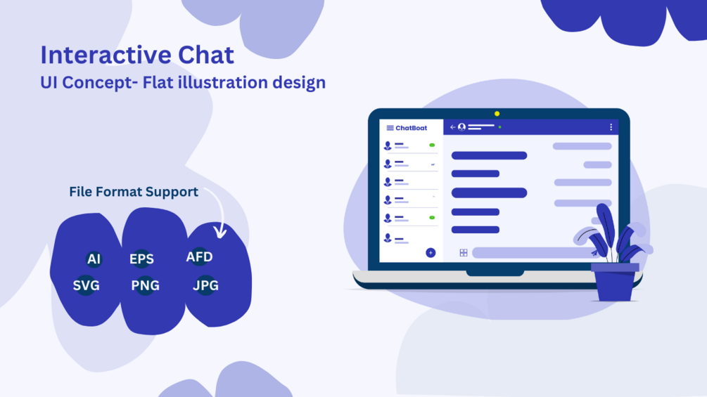 This modern "Interactive Chat UI Concept" vector illustration enhances your projects. Perfect for web, designers, and app makers, this clean and intuitive design showcases a professional user interface for chat applications. Easily editable, scalable, and ready for flat style in mobile apps, and websites. Available in high-quality vector format, this illustration offers smooth edges and flexibility for personal and commercial use.