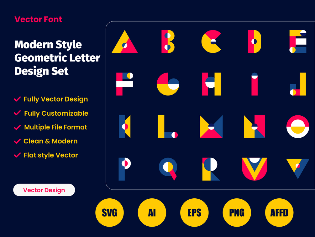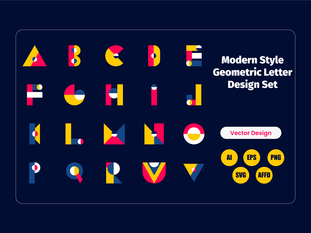 This pack includes all 26 letters of the English alphabet in multiple vector formats — AI, EPS, SVG, PNG, and Affinity Designer (AFFD) — giving you complete control for both print and web use. Perfect for designers who love a playful, Bauhaus-inspired, and colorful typographic aesthetic!